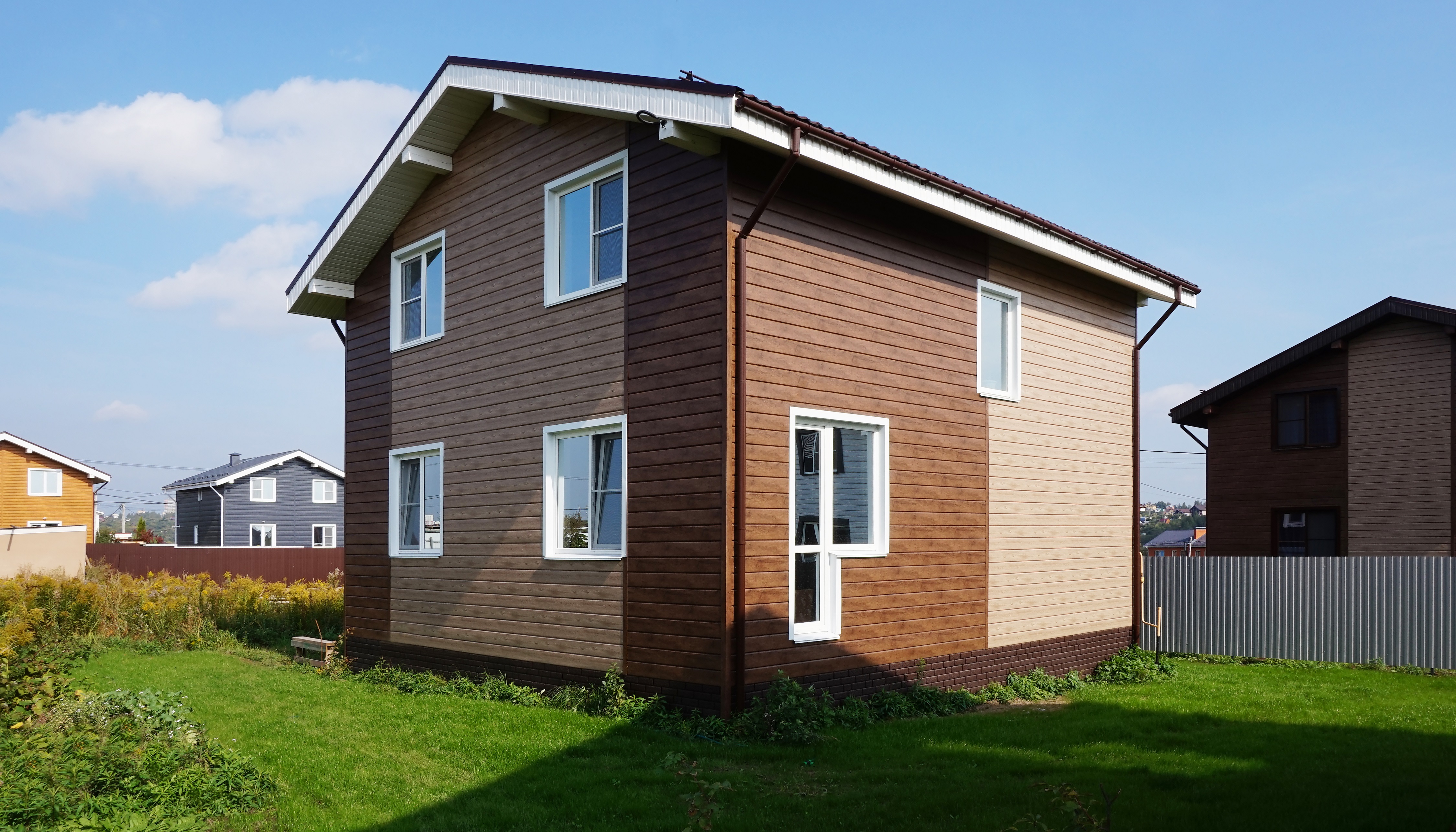 - В отличие от облицовки фасада деревом, металлический сайдинг «ЭкоБрус GL» прост в монтаже и не требует дополнительного послемонтажного ухода.