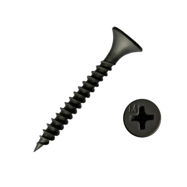 Метиз представляет собой классический остроконечный шуруп с резьбой по всему стержню. Имеет фосфатное покрытие, надёжно защищающее от коррозии, плоскую шляпку с крестообразным шлицем Phillips № 2 и маркировкой "М". Подходит для потайного монтажа — может быть утоплен полностью в поверхность скрепляемых материалов. Двухзаходная резьба на метизе обеспечивает более легкий и быстрый монтаж.